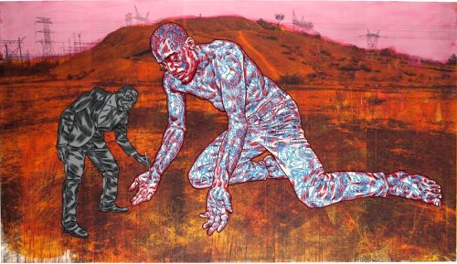 ‘Aloe’, from series ‘Jungle Queens’ oil on canvas, silver leaf Contemporary African artists are making their mark in all corners of the earth at present. Gallerists have recently represented their chosen artists at international Fairs such as 1:54 and the Frieze in New York while artists are about to represent their countries at the 58th Biennale in Venice. The Guggenheim in NY is currently showing the work of Simone Leigh. Other solo exhibitions are taking place in the UK, Sweden, Germany and in places as far afield as Seoul, S Korea where South African Nicholas Hlobo is holding his first exhibition on Asian soil with Lehmann Maupin gallery. On the continent itself, the gathering momentum of contemporary African art is undeniably explosive... so very exciting but very hard to keep up with! The ‘big guns’ get a lot of coverage so keeping the non-gallery-supported artists in sight is so very important. Endeavoring to show the full depth and breadth of scale of Africa’s creativity is daunting but continues to present a welcome challenge for CAA.com. Happy reading... ARTISTROBERT SLINGSBY This South African artist recently had a solo exhibition at the Circa Gallery/Everard Read in Johannesburg called In/Dependance. It offered a continued expression of the artist’s life-long fascination with indigenous populations and their natural environment. His dramatic, intense installation filled the somewhat constricted space with a blend of digital prints on aluminum, 11 printed hemp canvas panels collectively entitled ‘The people melt into the darkness and disappear and the sugar cane springs up’. Magnificent charcoal drawings on rag paper, 1000 vividly yellow glass flowers called “the Flower Trap”, bronze sculptures and twisted plywood also filled the room. The inclusion of concrete and glass lip-plates in the exhibition, are a nod to both popular trends and to the traditional culture of the Mursi tribe. “Through his work he expresses outrage at the uneven trade-off between history, identity, livelihood and the often bitter fruits of so-called civilisation which, for the poor and the marginalised, often bring servitude, displacement and the status of exiles even within their own lands”.